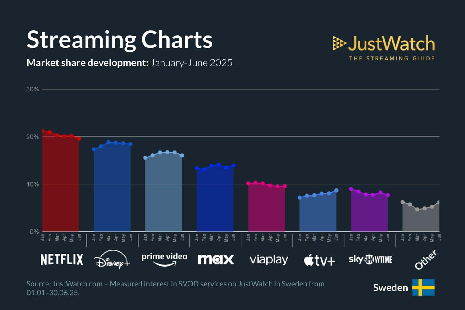 Under andra kvartalet 2025 behåller Netflix förstaplatsen med 20 procent av marknaden, tätt följt av Disney+ på 19 procent. Prime Video säkrar tredjeplatsen med 16 procent, medan Max ligger strax bakom på 14 procent. Viaplay har fortfarande en stark position på hemmamarknaden med 10 procent, trots tuff konkurrens från de globala jättarna. Apple TV+ och SkyShowtime delar på 8 procent vardera, medan övriga aktörer samlas på 5 procent.