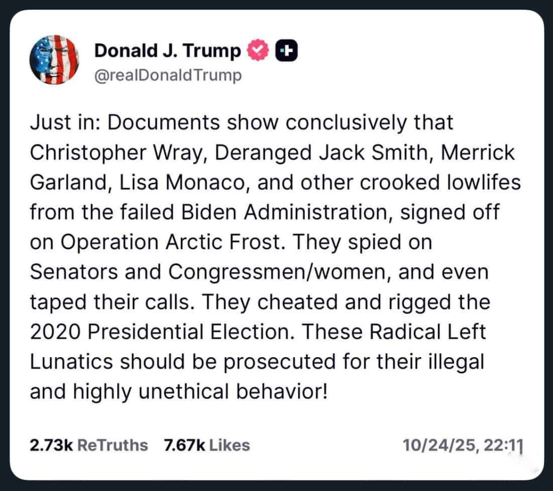Trump hävdar att enskilda, namngivna i inlägget ovan, som han också påstår ingick i Joe Bidens administration begått olagligheter och det har han nu bevis och dokument som styrker.