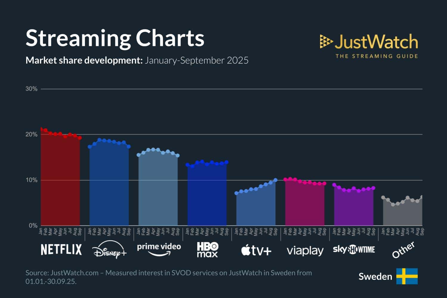 Netflix behåller toppositionen med den största marknadsandelen på 20%, tätt följd av Disney+ på 18% och Prime Video på 16%. Tittar vi på utvecklingen under året har marknaden varit relativt stabil, även om Netflix, Disney+, Prime Video och HBO Max alla uppvisat en liten nedgång eller stabilisering sedan årsskiftet.