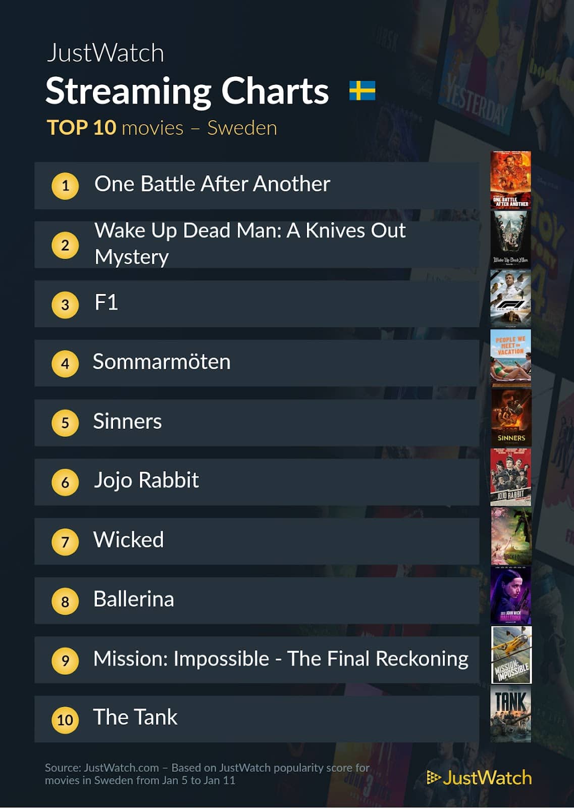 Statistiken för filmstreaming visar att publiken dras till stora produktioner och spännande uppföljare. Listan toppas av krigsskildringen One Battle After Another. På andra plats återfinns mysteriet Wake Up Dead Man: A Knives Out Mystery, följt av den fartfyllda F1.