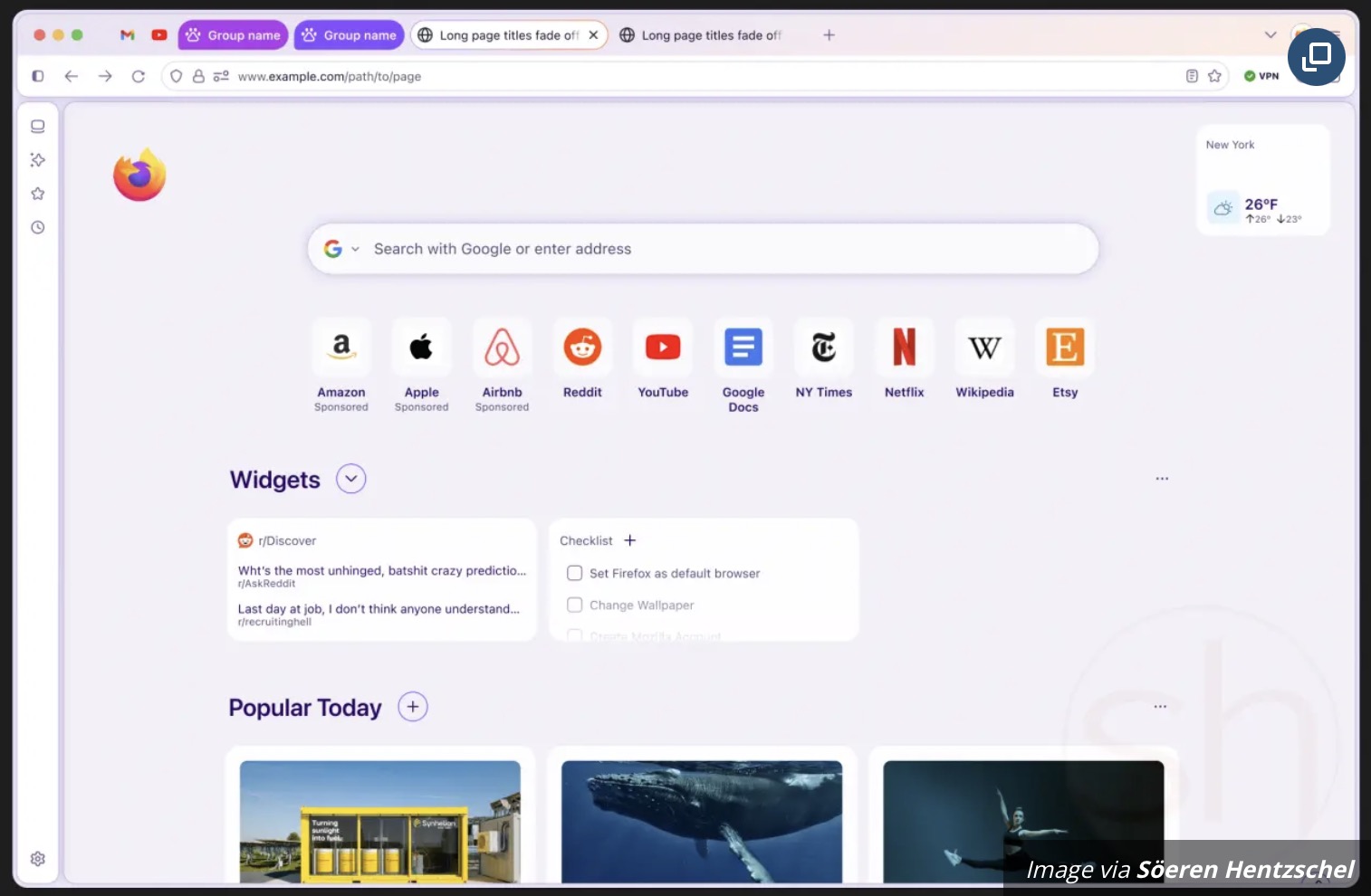 Skisserna tyder på att Mozilla har hämtat inspiration från Googles Material You. Webbläsarens färgtema påverkas av skrivbordsbakgrunden genom dynamisk färgextraktion. De övre navigeringsfälten ändras automatiskt för att matcha nyansen om du väljer en mintgrön bakgrund.